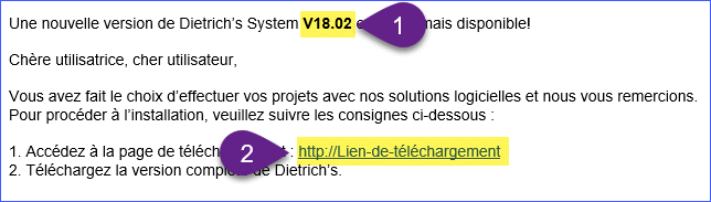 Cet email contient différentes informations ainsi que des liens. Le n° de version Dietrich's ❶ est indiqué dans le corps du message.