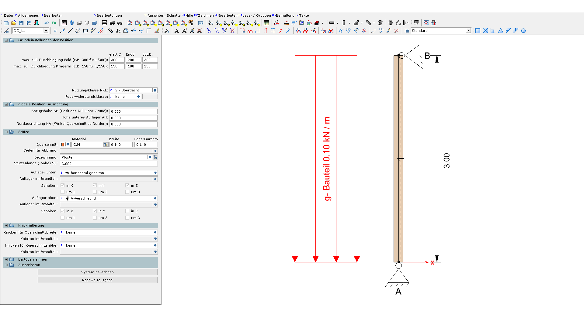 Il modulo per il dimensionamento di montanti vi permette di verificare sia appoggi pendolari sia incastri. Ai fini del calcolo non è necessariamente importante che all’estremità superiore ci sia un appoggio. In questo modo sarà possibile verificare anche montanti incastrati.