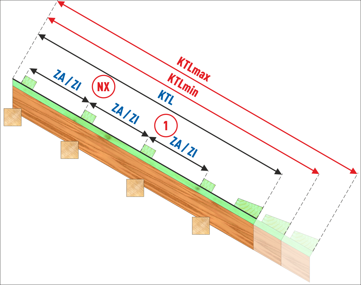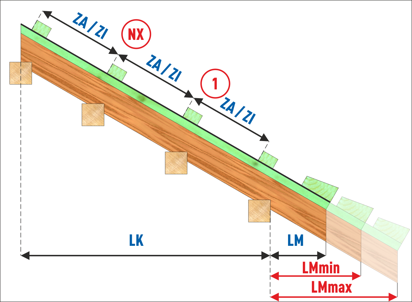 Długość połaci do dystrybucji łat jest wyznaczana na podstawie: kąta nachylenia połaci dachu i długości krokwi. Obliczenia uwzględniają wysokość kontrłaty. Wybór tej opcji będzie skutkował informacją o minimalnym i maksymalnym wydłużeniu krokwi przy braku możliwości wyznaczenia średniego rozstawu łat.
